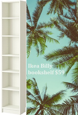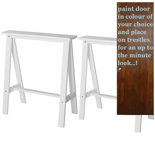 Similarly, go to a junkyard or tip shop and find an older style door; the older doors from the 1960’s are usually a lot narrower, paint it in the colour of your choice (pastels are big at the moment) and place on two trestle table legs. Officeworks trestle legs white pair $69. This large space will allow not only a lot of books in small vertical and alternate horizontal stacks but you could buy let’s say four concrete blocks paint them white also, place them on the table (door) at the very back and you now have another level to put books, a vase of flowers with them and maybe a picture or two to create a beautiful tableau.
