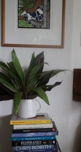 Buy an old trunk that has flat ends, turn it up vertically back against the wall and put two stacks of books inside to the top; the outside upper surface could then have a fruit bowl, vase of flowers, a picture. You would need to secure it to the wall at the top back, especially if there are again small children in the house ? and you don’t want to allow the Elephant another triumph…!