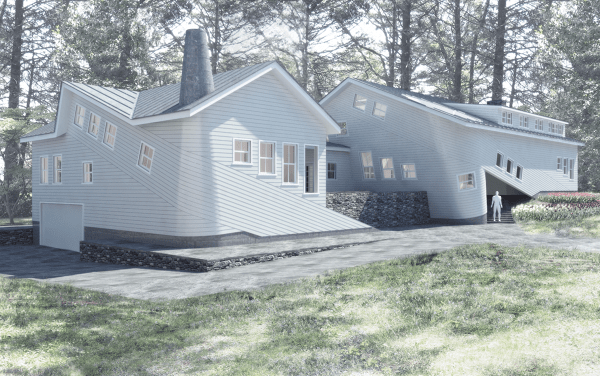 Epker House: “Mediating between the vernacular shapes and a more contemporary material aesthetic, the Epker house exhibits a calibrated deployment of cone geodesics to produce a smooth and continuous wrapping with conventional clapboard siding around its figurative corners. Unlike the pixilated cladding of the shingle style, the conventional siding rectangles require specific profile angles and radii of curvature of the cone to which they are applied. This precise calibration allows critical alignments to be achieved–levelness, roof slopes and stair slopes.