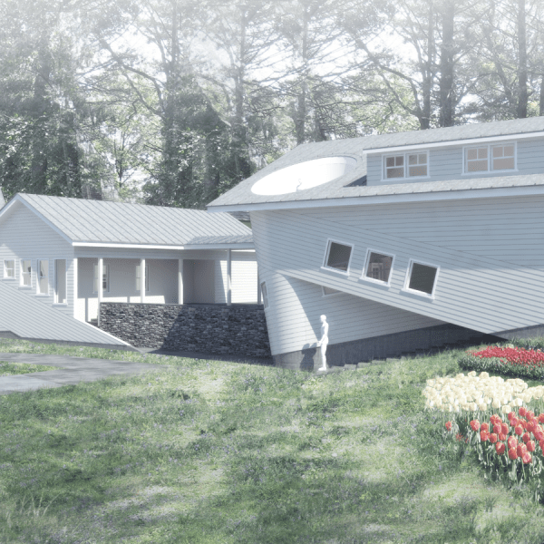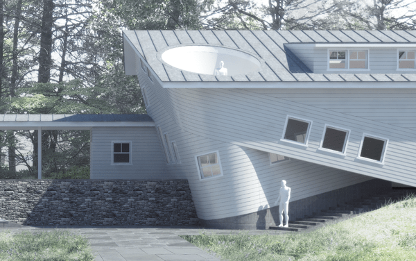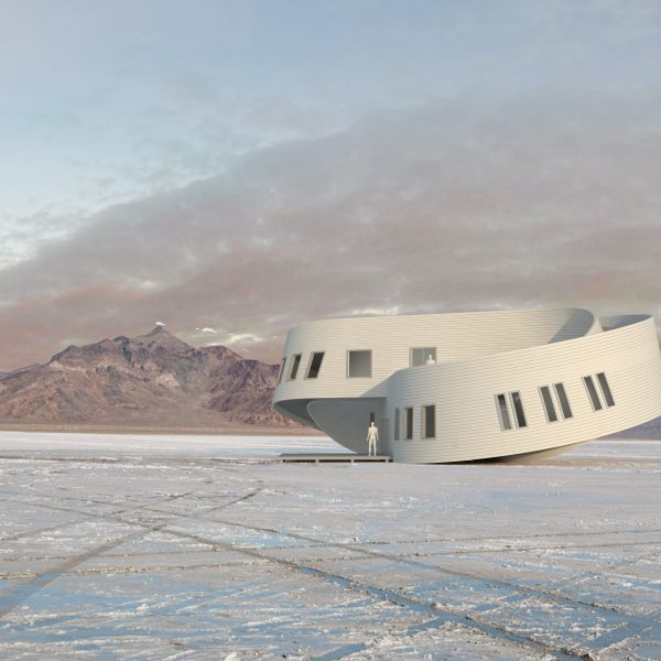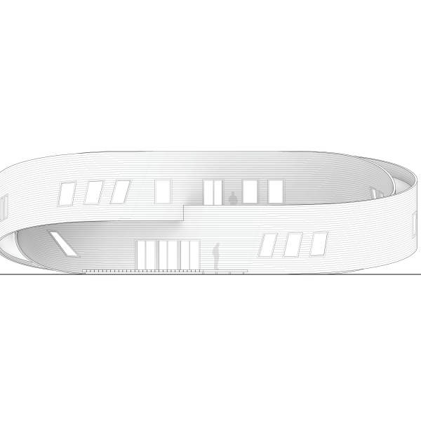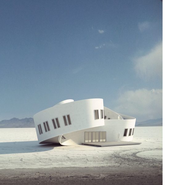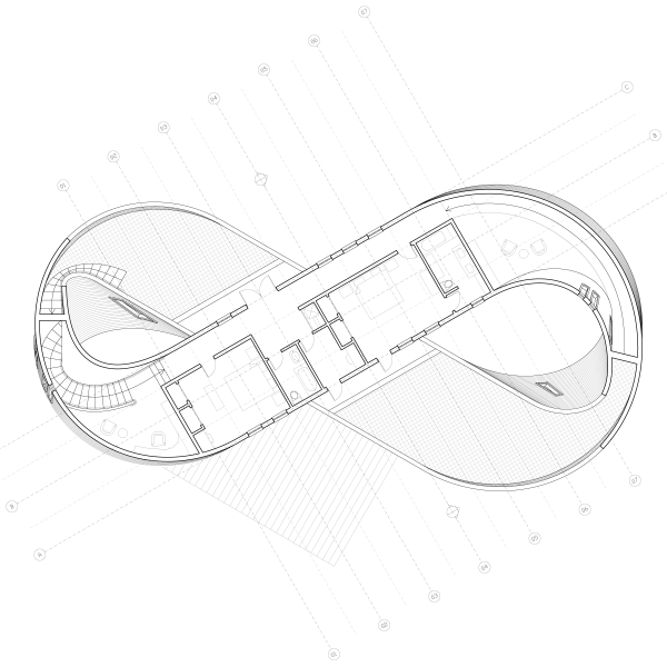 Geodesic House 2: Constructed Dynamism: In Geodesic House 02, specific geometric properties of smooth and piecewise continuous developable surfaces bind together the articulation of architectural space, the tectonic unit of construction, and the circulatory path of the subject. A technique developed called “geodesic leveling” allows smooth transitions between sloped circulation paths and level floors to be achieved with standard planks of siding. The speculative intent is to use geometric knowledge of developable surfaces to inform generative techniques producing architectural idioms which have intelligent and economical relationships to fabrication and construction.