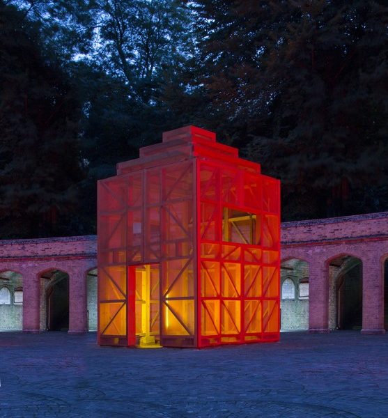 “A Very Small Part of Architecture resurrects Austrian Modernist architect Adolf Loos’s 1921 design for a mausoleum for art historian Max Dvorák. Though never built, the image of Loos’ design has haunted architectural culture ever since. Here the heavy dark and masonic form is recreated at 1:1 scale using a lightweight timber frame and scaffold net: A ghostly reenactment of an unrealised architectural idea.”