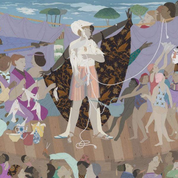 Kushana BUSH, Maybe the people (2015), gouache, metallic paint and pencil,image) 84.0 x 97.3 cm (framed), National Gallery of Victoria, Melbourne, © Kushana Bush. Kushana Bush (New Zealand born 1983) considers herself a contemporary storyteller. She paints highly detailed multiple-figure compositions in which enigmatic and often violent narratives unfold. The critic David Eggleton has described her style as ‘eccentric historicism’. Bush draws on various historical and stylistic sources, from medieval Christian art to Indo-Persian miniatures and Japanese woodblock prints. In each scene, the joyous colour and decorative quality is undercut by a pervasive sense of threat and claustrophobia that derives from the crowded compositions and the actions and gestures of the figures. Kushana Bush has said of her work that ‘borrowing and adapting imagery, not of my time or place – and crucially, getting it wrong – somehow produces pictures that speak of the here and now. I’m very attracted to that cycle of collapsing interpretations, it keeps you yearning’. In many of her images Bush depicts groups of people on a stage, with some directly involved in the action, while others look on. She sees this as a metaphor for watching world events from Dunedin, New Zealand, describing herself as one of the ‘lucky observers, who lick ice creams while the world implodes’.