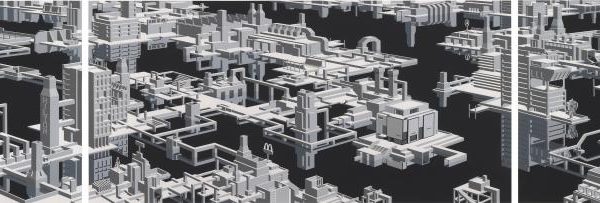 Richard Giblett, Sump system 2015-2016, gouache on three sheets, 111.5 x 221.5 cm (sheet) (each) 119.0 x 684.0 cm (framed triptych), National Gallery of Victoria, Melbourne, © Courtesy of the artist and Murray White Room. In the vast triptych Sump system, 2015–16, Richard Giblett (Hong Kong born 1966, emigrated to Australia 1973) depicts a complex network of tower blocks, chimneys, funnels and pipes, which is mirrored in a deep black sump that resembles a massive pool of black oil. This industrial landscape draws attention to the consumption of resources in today’s cities, and recognisable icons of corporations and international brands, including IBM, Hilton, IKEA and McDonald’s, can be identified within this labyrinthine structure. Giblett imagines a dystopian world of mass production – the ‘sump system’ that underpins our consumer habits, and yet remains largely invisible.
