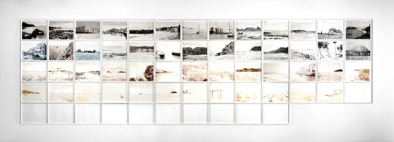 Jorge Méndez Blake Bartlebooth Monument 2011- 2015Ink, pencil, paper, 50 x 70cm each, 62 pieces, Courtesy the artist and Galeria OMR, ©Photoservice Art Basel 2015. Jorge Méndez Blake (Mexico born 1974) explores the connections between literature and fine arts in his installations and drawings. The neon work Complete poems, 2015, represents a collection of poetry, functioning both as a semiotic and material ‘sign’. As the artist explains: ‘I approach art as someone who is trying to write, but without writing. I make two- and three-dimensional objects that occupy the space between disciplines, where the margins of literature, art, and architecture overlap.’ His suite of drawings Bartlebooth monument, 2011–15, presents the conclusion to an unfinished fictional project described in the novel Life A User’s Manual (1978) by French writer Georges Perec. One of the protagonists is the millionaire Percival Bartlebooth, who embarks on a life-long project to produce 500 watercolours of ports and beaches during a twenty-year trip around the world. Once completed, Bartlebooth despatches each painting to a master craftsman in Paris to turn it into a jigsaw puzzle. After two decades Bartlebooth returns home and begins to assemble the jigsaws. Once completed, each work is sent back to the port where it was painted and soaked in a solution, whereupon the blank painting is returned to Bartlebooth, leaving no trace of his life’s work. Tragically, Bartlebooth dies while working on a jigsaw, having finished only 438 of the planned 500 puzzles. Méndez Blake’s piece presents the missing sixty-two drawings of ports and beaches, which are in the process of fading into nothingness.