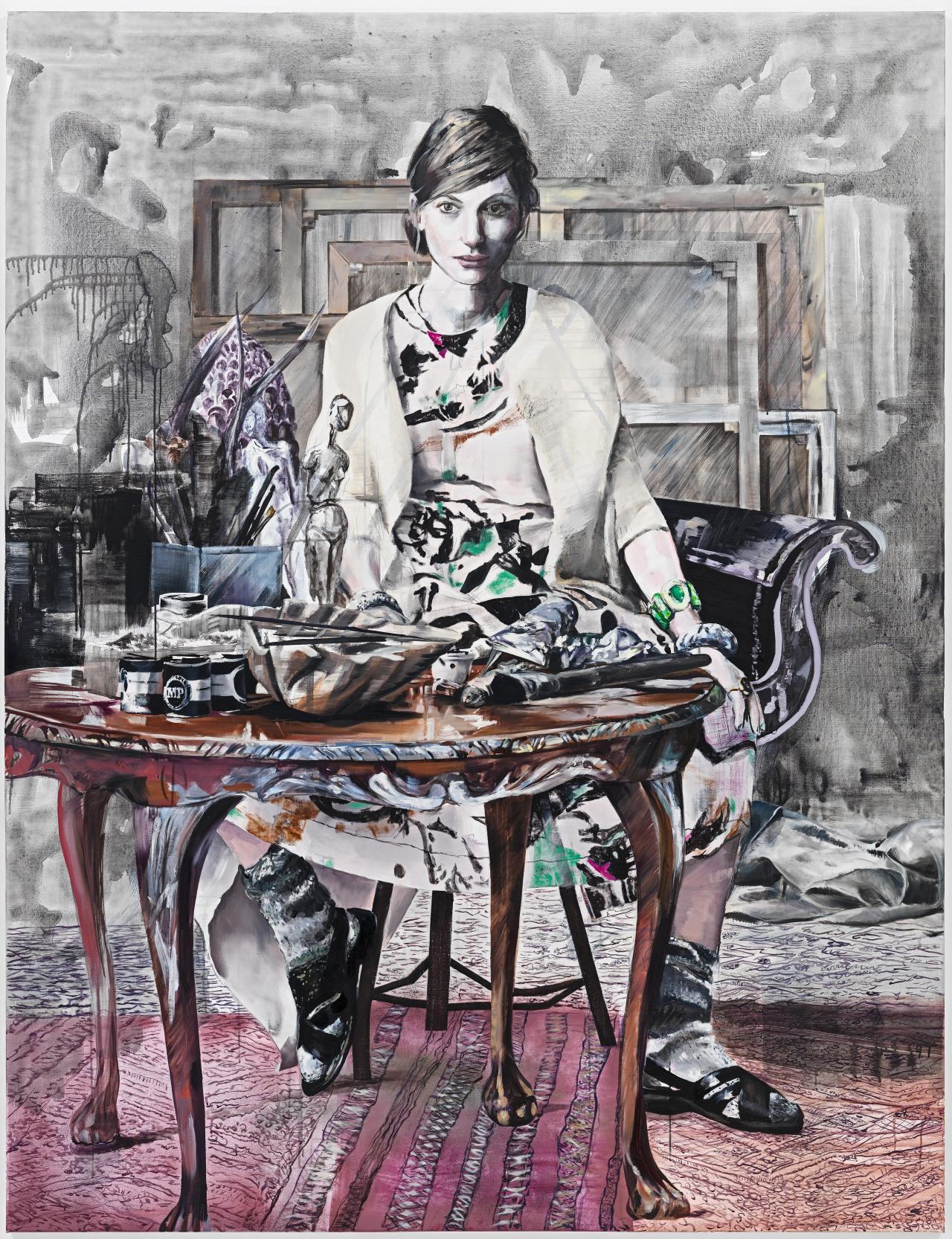 Paulina Ołowska,The painter 2016, National Gallery of Victoria, Melbourne, © Paulina Ołowska; Image courtesy Paulina Ołowska and Metro Pictures, New York, © Courtesy of the artist and Metro Pictures, New York. Paulina Ołowska’s (Poland born 1976) work is influenced by the history of avant-garde art, traditional crafts and experimental theatre traditions of Poland and other former Soviet countries. Using performance, sculpture, painting, neon and fashion, she revisits history, often shedding light on underappreciated female artists. Ołowska’s works combine portraits of women from gardening magazines with elements from Slavic mythology and folklore, as well as techniques from Les Nabis – artists who left Paris to live in the countryside in the 1890s. The paintings incorporate esoteric references to rural living and represent Ołowska’s ‘active muses’ – characters with specialised knowledge, including fungi and butterfly experts, gardeners and artists.