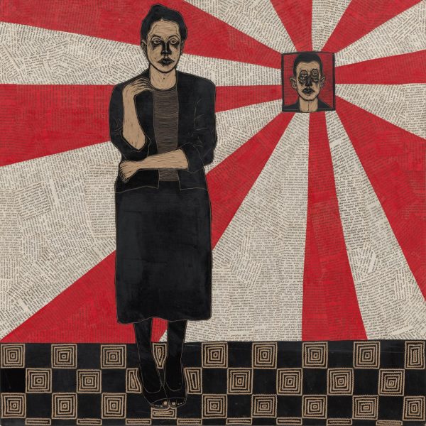 Ephrem Solomon, Untitled (LT001) 2016 from the Signature series 2016, synthetic polymer paint and black pencil on collage of cut printed paper on synthetic polymer paint on composition board, 84.8 x 85.1 cm, National Gallery of Victoria, Melbourne, © Ephrem Solomon Tegegn. The works from Ephrem Solomon’s (Ethiopia born 1983) Signature, 2016, series show the artist’s bold graphic style and unusual medium, which combines hand-carved wood panels, collaged printed text and hand-colouring. Solomon’s images are inspired by the residents of his hometown Addis Ababa, where a large part of the population lives in difficult circumstances, with very few social, political or economic opportunities. As Solomon states, ‘My works portrays the distance between what the governed people need and want, and what the response is from the governors. I have tried to picture, as precisely as possible, the actual and innocent feeling of the governors.