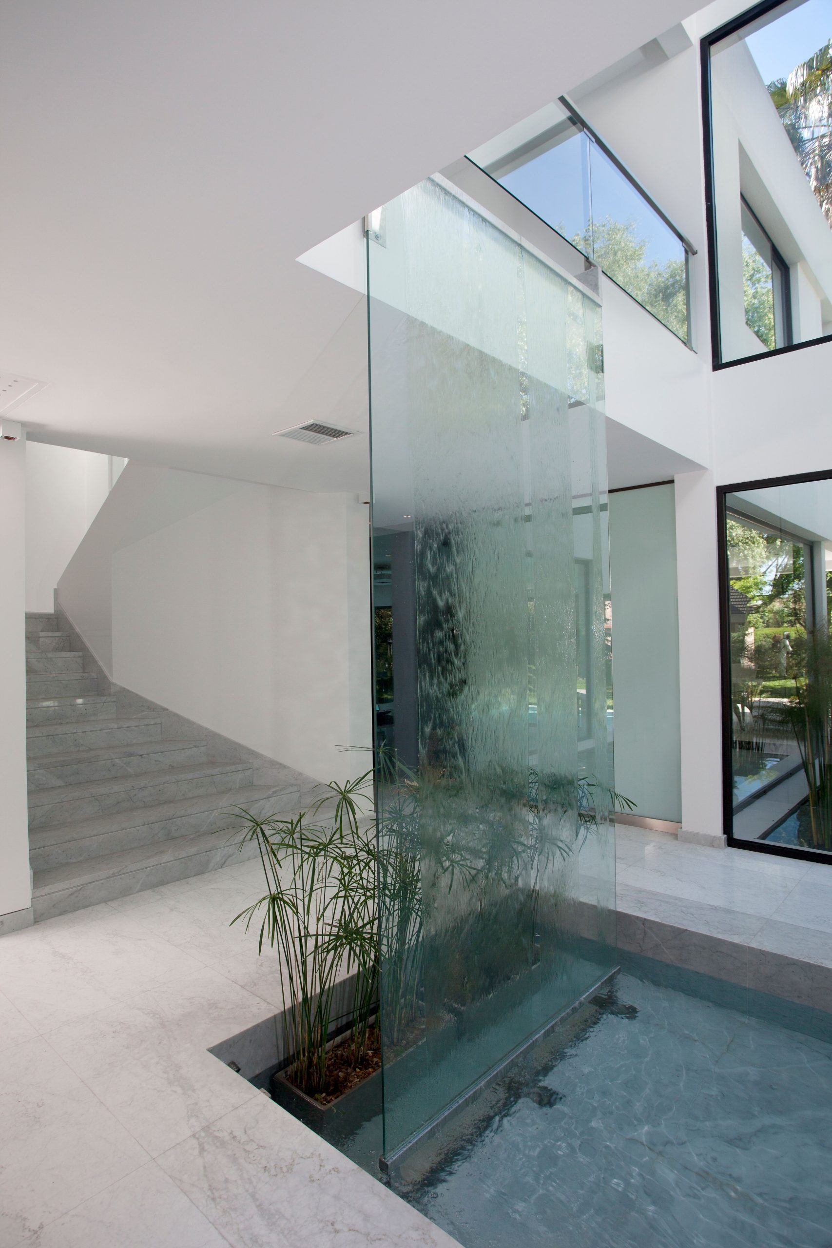 A stylish detail which links to nature through the water and the plant life but also through the glass reflecting light and leading your eye to appreciate the beauty of what is above; a tableau in three dimensions. The skylights throw shapes which imprint on the glass and make constantly changing patterns. Alternatively the little pond can symbolise a perpetual wellspring nurturing the house. Plus a mere transitional space is now an energised space with a designated function of its own: permanent art installation and a briefly contemplative space.